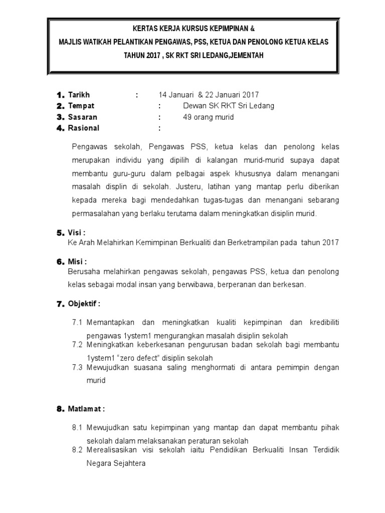 Kertas Kerja Kursus Kepimpinan Pengawas Smk Tengku Budriah Tahun 2016 Pdf